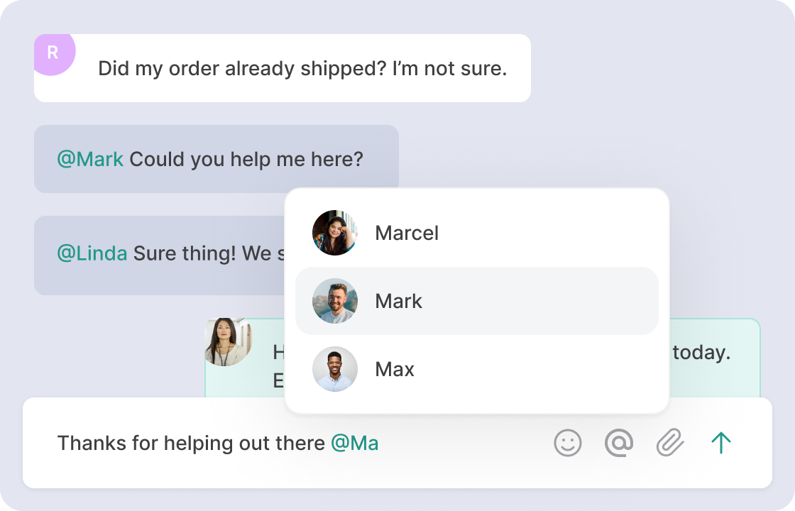 @tagging feature in Trengo makes it possible to get help from colleagues quickly. Below any customer conversation, team members can @mention each other and discuss the matter internally to find a solution - all without troubling the customers.