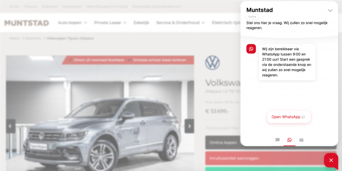 Muntstad, one of the most well-known automotive companies in the Netherlands, offers service via email, telephone, WhatsApp Business, Facebook Messenger, and live chat.
