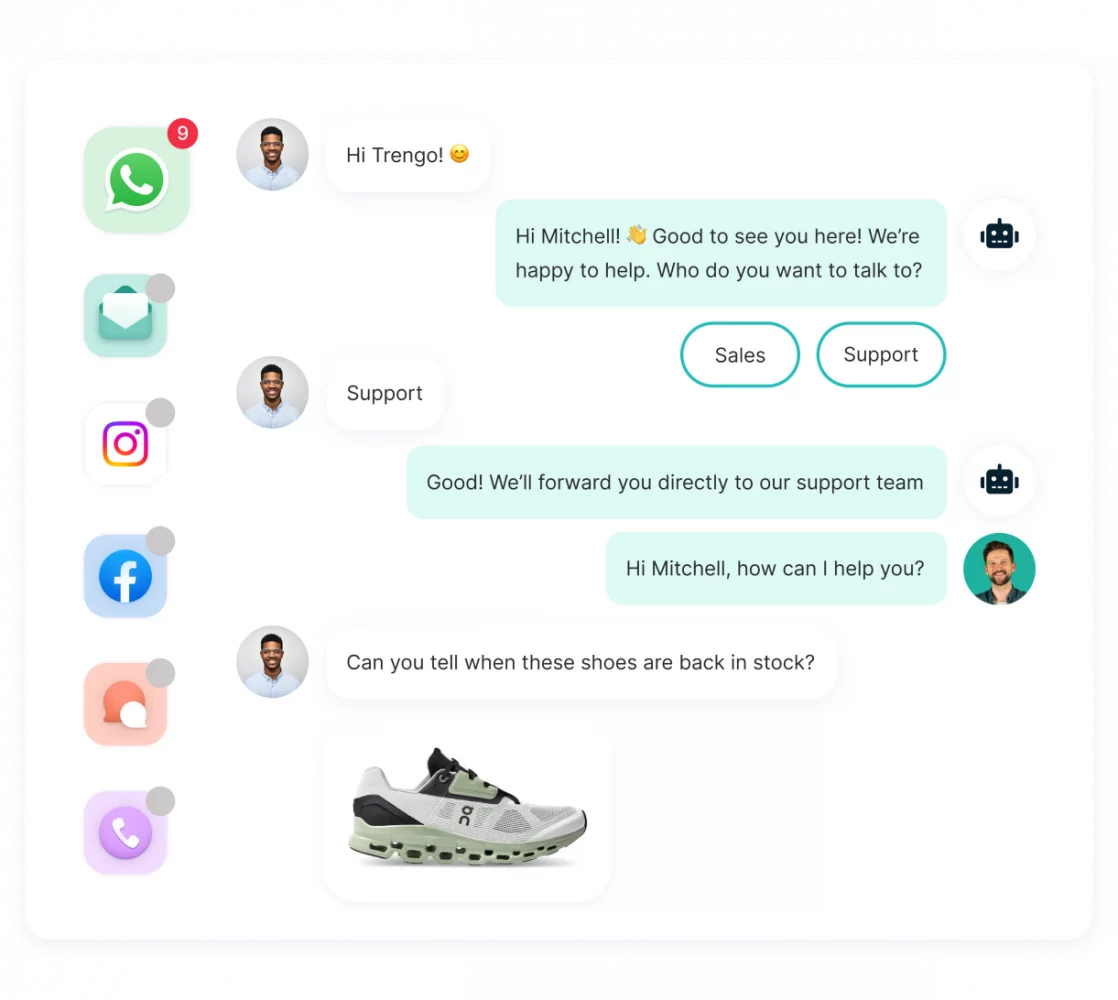 - Native integrations: Trengo offers native integrations with Instagram, Google’s Business Messages and Telegram.
