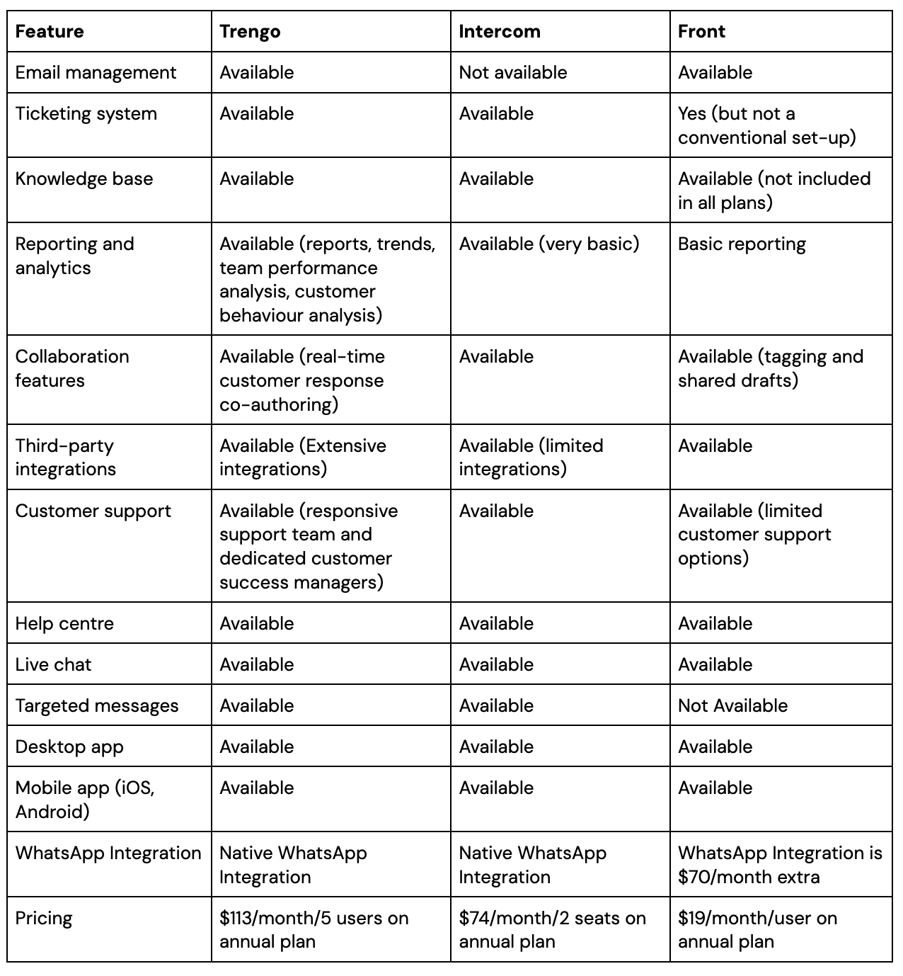 Here are all the main features of Front vs. Intercom vs. Trengo compared side-by-side:
