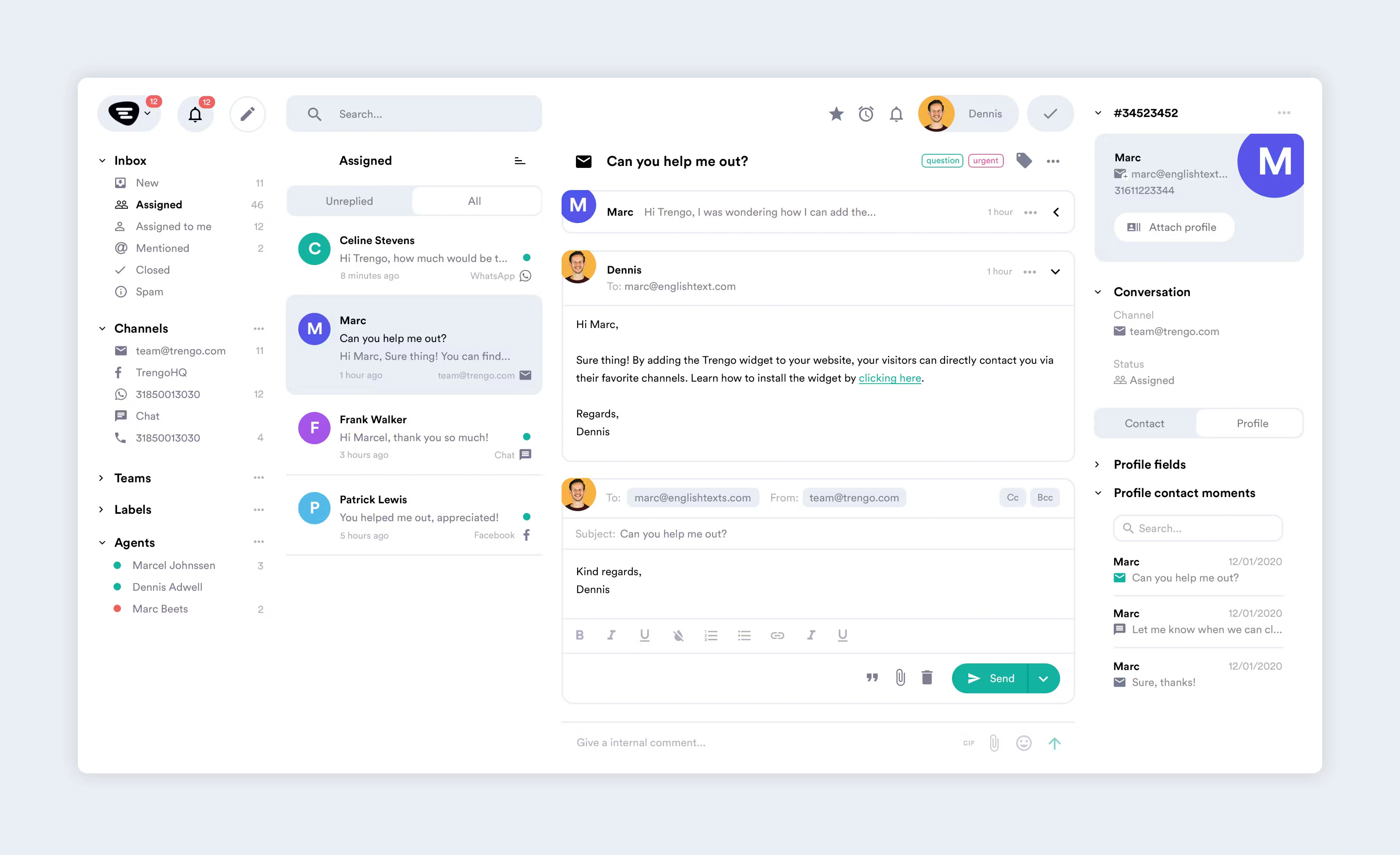 Trengo’s also has a special focus on real-time collaboration, which is kept more in the background of Front and Intercom’s feature developments. Trengo lets you co-author responses in real-time allowing you to tackle an inquiry as a team to reduce ticket resolve time.