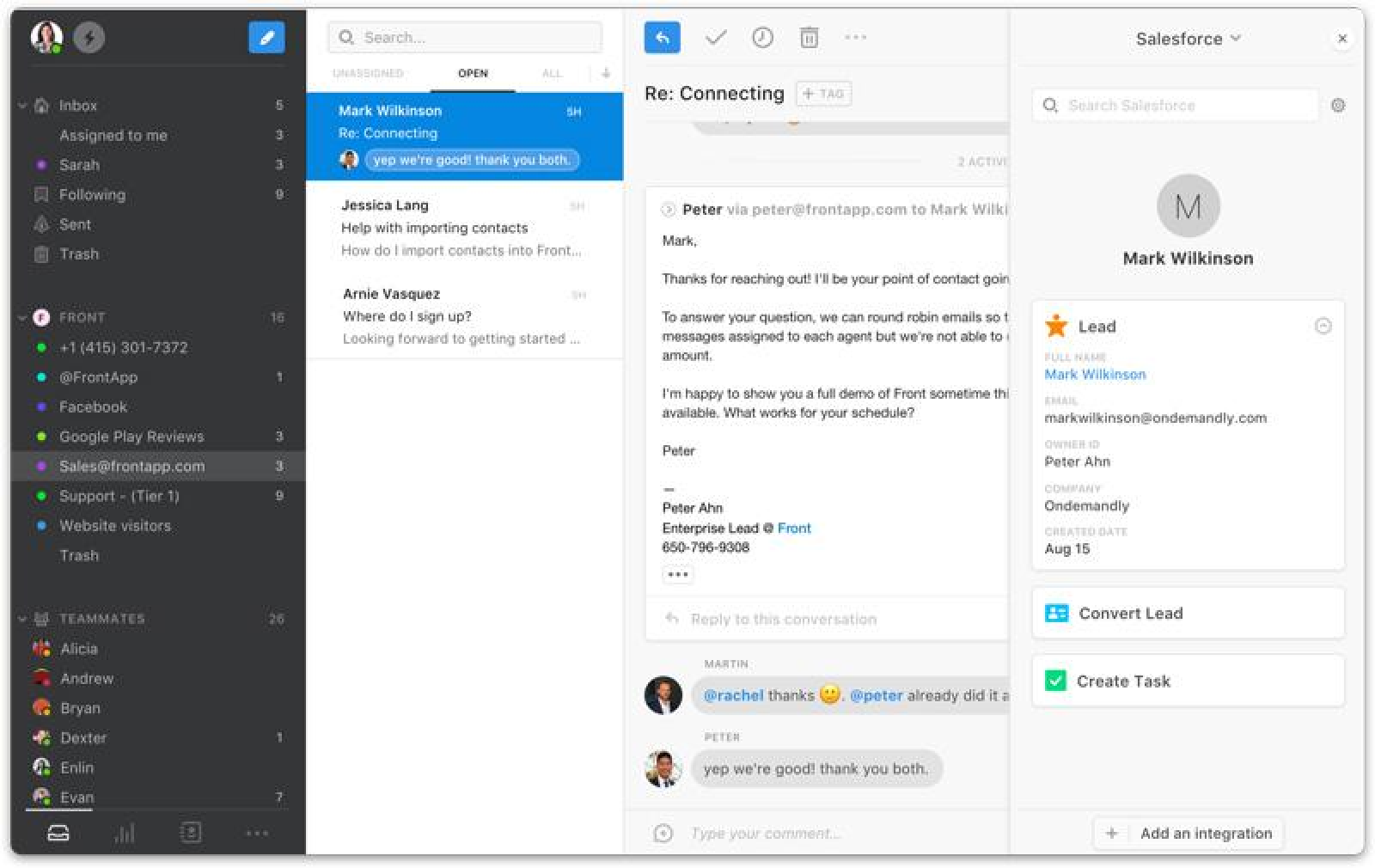 With Front, your team can work together to respond to customer questions. If a newer customer support agent can’t answer a question, they can get their customer success manager to jump into the conversation and help out easily (in real time).
