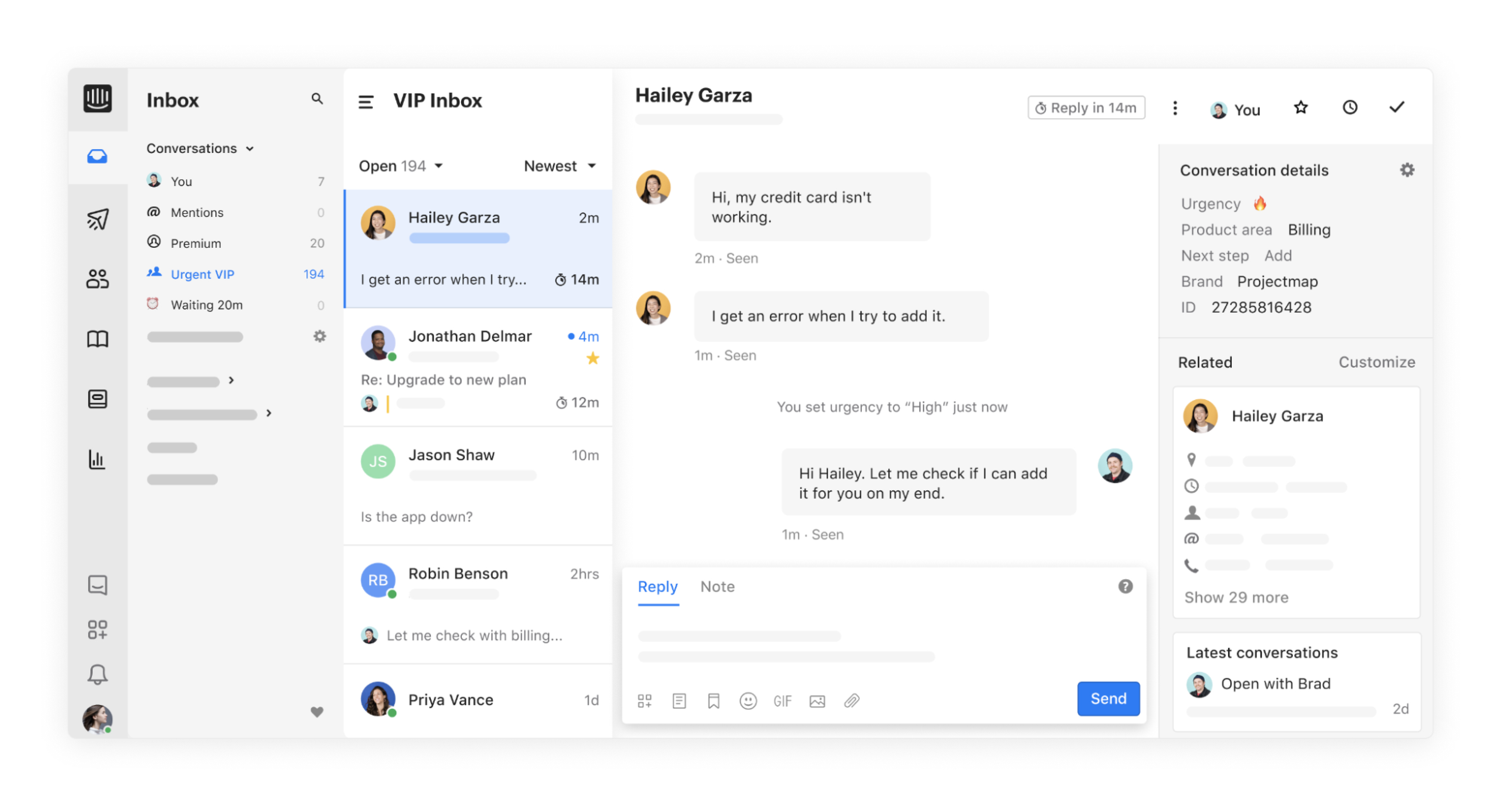 To give your customers the best possible experience, you need to be able to see their historical interactions and purchases with your company. Front lets you do this (not available on their Starter plan) so you can personalise interactions with your customers.