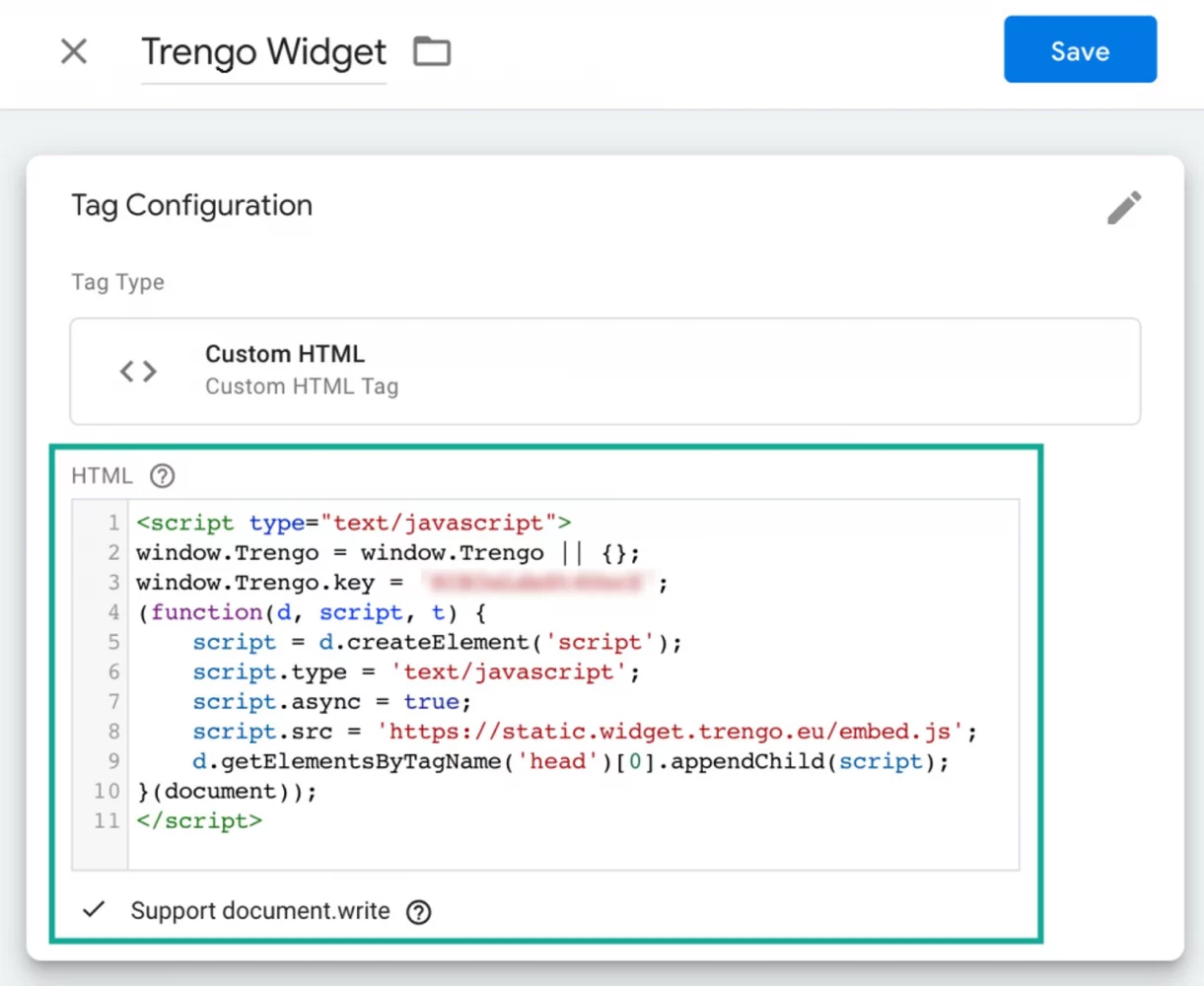You can find the code by going to Settings > Settings > Web Widgets > Your website widget > Installation. And paste it into the ‘Tag configuration’. After that enable ‘Support document.write’.