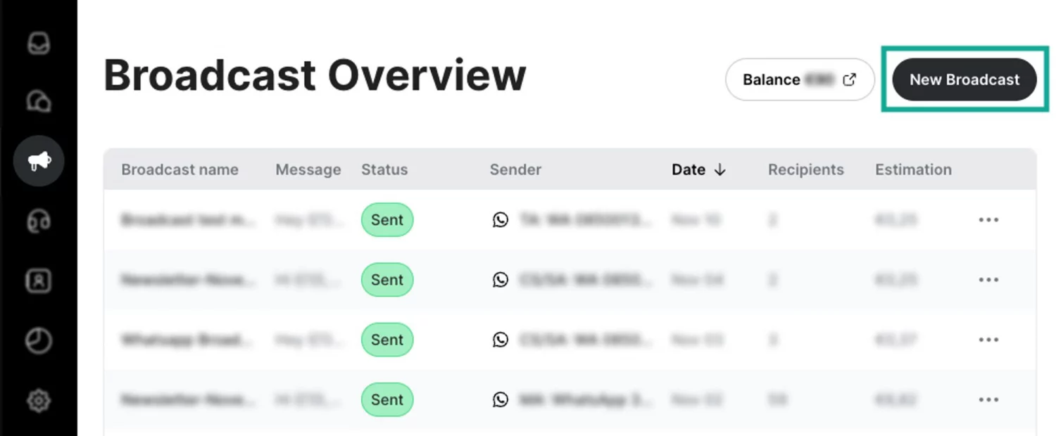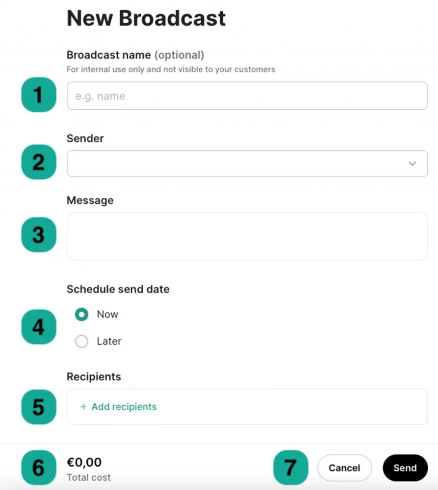- Sender: WhatsApp, SMS, or other, where would you like to send your broadcast? Select the right channel here.