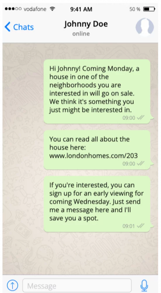 - Automatically send WhatsApp updates (i.e. “Don’t forget about tomorrow’s house viewing at 1 pm!”).
