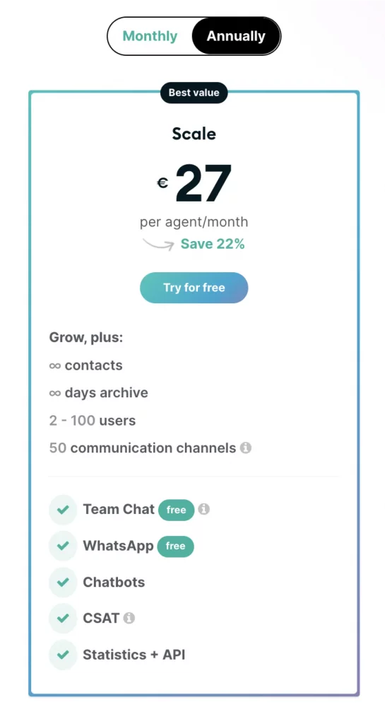 Trengo’s Scale plan includes WhatsApp (and features team chat and chatbots) and costs €27 per user/month. Check out the full pricing plan here.
