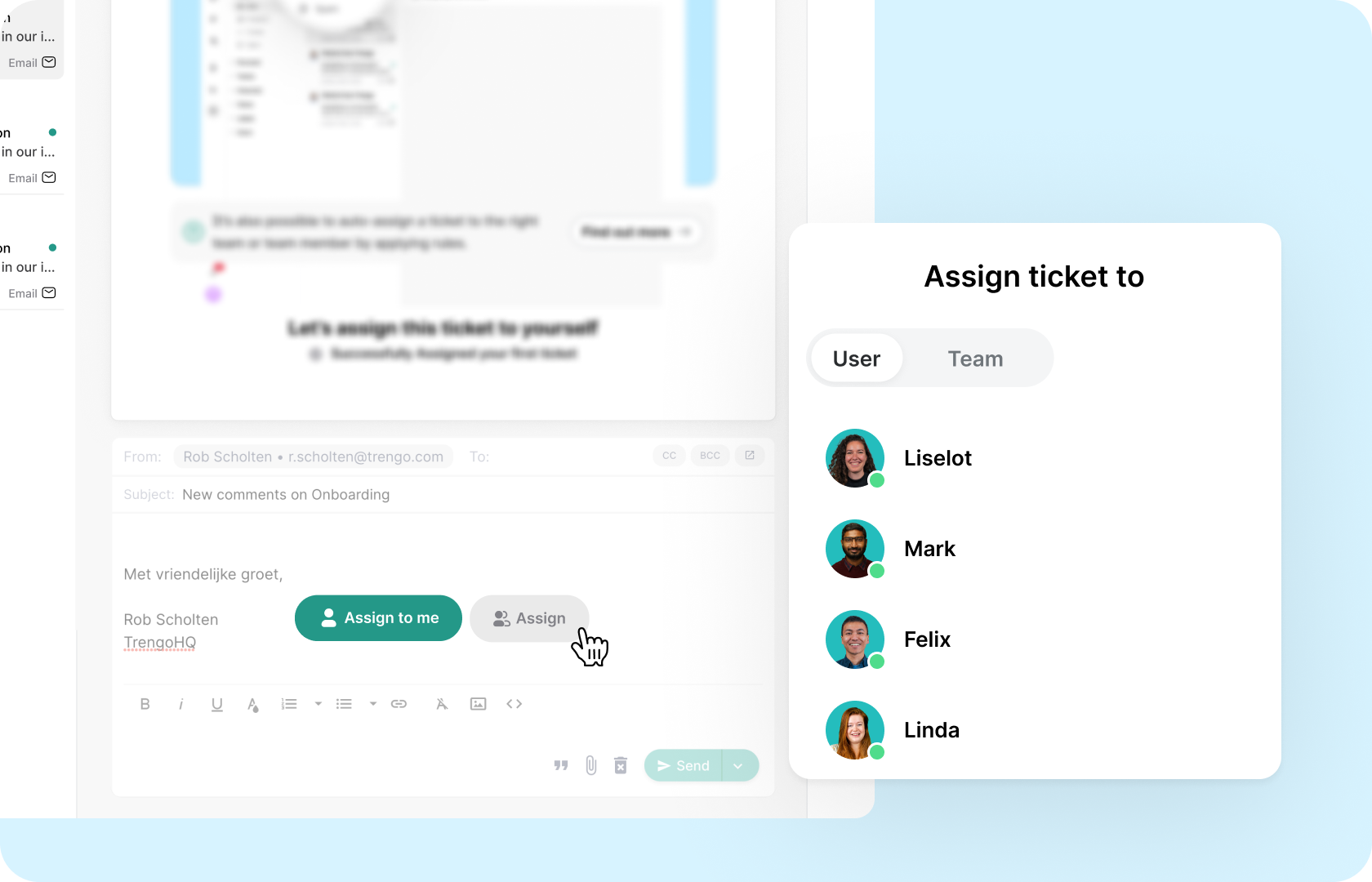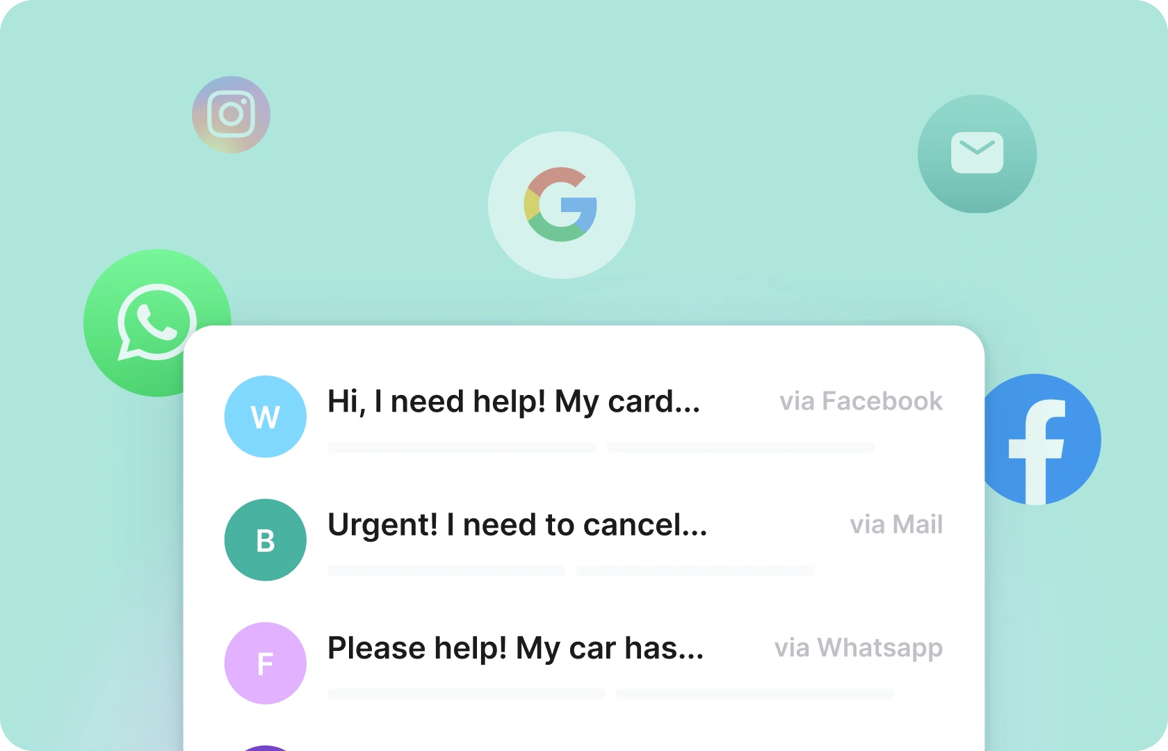 Add channels that are readily used like Facebook, WhatsApp, email, voice and more to your inbox. Give everyone the opportunity to get in touch easily, ask questions and find answers.